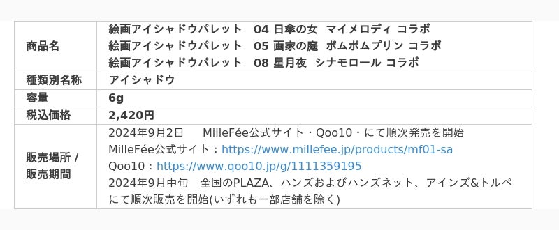 本製品は2024年9月2日(月)12時よりMilleFee公式サイト・COSME DELi公式サイト・Qoo10にて順次販売を開始する予定です。店頭では同年9月中旬より全国のPLAZA、ハンズおよびハンズネット、アインズ&トルペにて順次販売をする予定です。(いずれも一部店舗を除く)