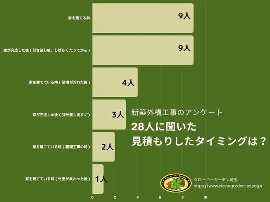外構工事を専門としている有限会社クローバーガーデン(本社:埼玉県)は、 一戸建て住宅に住んでいる人を対象にアンケート調査を実施。今回は「外構見積もりのタイミング」だけに焦点を当てたレポートです。