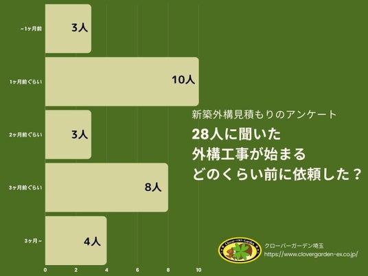 また、外構工事の依頼タイミングに関しては、大多数の人が工事開始の1~3ヶ月前に依頼しており、1ヶ月前が35%で最も多く、次いで3ヶ月前が28%でした。