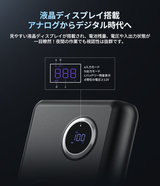 ・正面の液晶ディスプレイで、バッテリー残量や電圧を一目で確認できます。