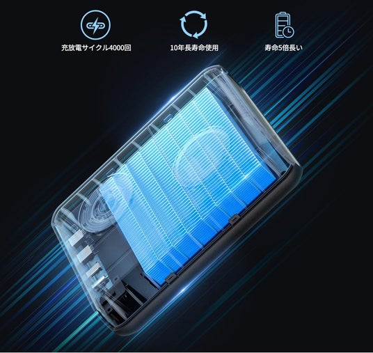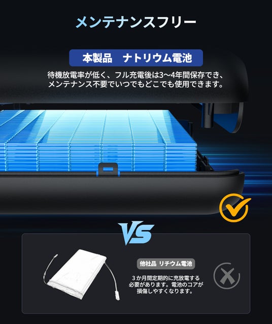 本製品には、従来のリチウム電池に代わり、最新のナトリウム電池を採用しています。ナトリウム電池は熱に強く、発火や爆発のリスクが極めて低いため、安心して使用できます。車内に長期間保管しても自然発火の心配がありません。