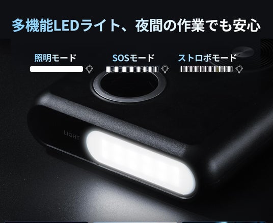 ・「点灯/SOS/ストロボ」3モードの切り替えが可能なLEDライトを搭載しており、屋内外の夜間作業、夜釣り、キャンプなどのアウトドア照明に最適です。