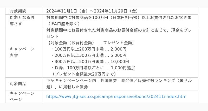 また、「プライマリーPB」資格保有者の所属企業上位10社にランクインしたことを記念し、2024年度上半期(4月から9月)の間で人気の高かった米ドル建債券を対象に、購入金額の合計に応じて最大20万円の現金をプレゼントする米ドル建債券お買付キャンペーンを実施いたします。キャンペーンページでは、人気銘柄の中から豊富な知識をもったJTG証券のプライベートバンカーが、お客さまの投資目的にあった商品を選定しておりますので、銘柄選びにご活用ください。