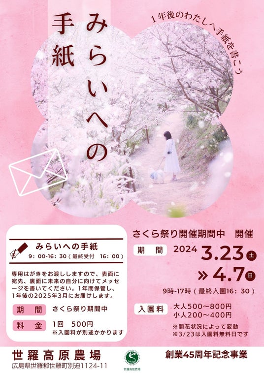 世羅高原農場創業45周年記念事業として、今年は「みらいへの手紙」として、1年後の自分に宛てて手紙を書くイベントを開催します。1年間預かった手紙は2025年3月にお届けします。桜の季節に、1年後の自分を想像しながらメッセージを残しませんか。