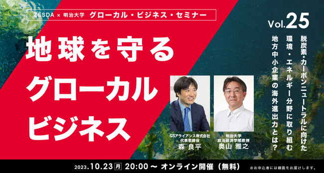 特定非営利活動法人ZESDA(代表理事:桜庭大輔、所在地:東京都中央区、以下NPO法人ZESDA)は、2023年10月23日(月)にグローカル・ビジネス・セミナーvol.25を開催します。今回は、海外での環境問題の解決に積極的に取り組んでいるGSアライアンス株式会社 代表取締役 森 良平(もり りょうへい)さんに「地球を守るグローカルビジネス」というテーマでお話いただきます。