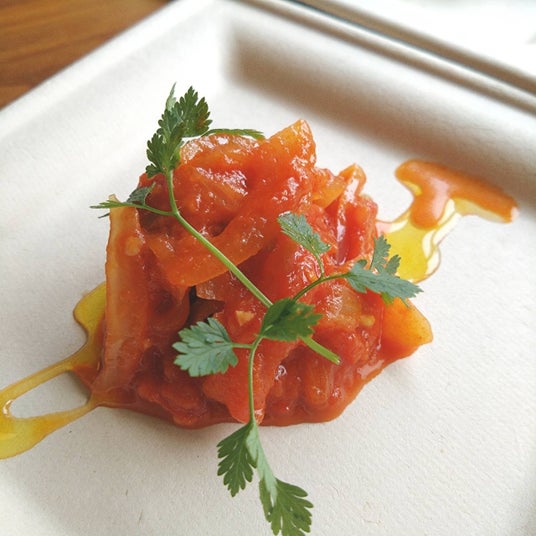 前菜はタコと新ジャガイモのマリネ、テリーヌ、自家製パンのオープンサンドの盛り合わせとミートボールのトマト煮。前菜がテーブルに運ばれた時点で見た目の美しさに会場からは感嘆の声が上がりました。