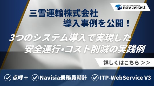 株式会社ナブアシスト(本社:群馬県前橋市、代表取締役:江口 大介、以下 ナブアシスト)は、三雪運輸株式会社(本社:愛知県名古屋市中川区、代表取締役:岡田 雅、以下 三雪運輸)が、『点呼+』『Navisia乗務員時計』『ITP-WebService V3』の3つのシステムを段階的に導入し、精密機器輸送という高度な輸送品質が要求される環境下で、業務効率化と働き方改革を同時に実現したことをお知らせします。