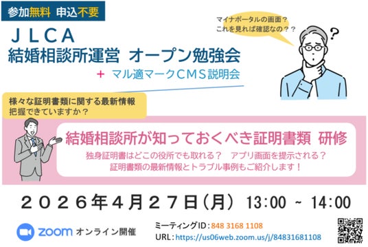 【 特定非営利活動法人 日本ライフデザインカウンセラー協会(JLCA)について 】特定非営利活動法人 日本ライフデザインカウンセラー協会(以下 JLCA)は、2007年1月に設立しました。設立時、国民生活センターに寄せられる結婚相手紹介サービス業いわゆる結婚相談所への相談件数は約3,000件を数え、業界への信頼性低下が非常に懸念される状況でした。そのような中、JLCAは第3者認証機関として「結婚相手紹介サービス業認証制度に関するガイドライン」を基準とした「マル適マーク」の認証発行を2008年12月より開始。当初176事業所だった認証件数は2025年3月現在 約610事業所を数えます。JLCAは「マル適マーク」発行の認証事業と、結婚相談所への研修講座事業を通じ、更なる結婚相手紹介サービス業の信頼性向上に貢献するとともに、結婚を求める消費者の安心・安全な婚活に寄与することを社会的使命とすべく活動しています。