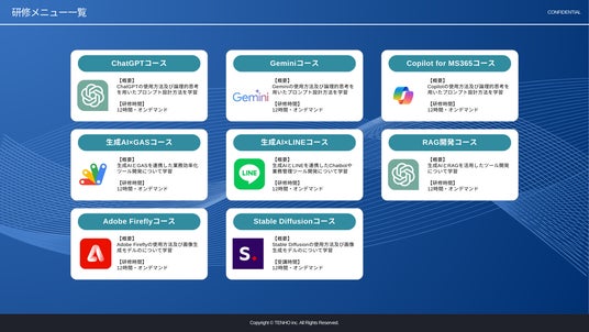 研修プログラムは全8コースで、「ChatGPTコース」をはじめ、「Copilot for MS365コース」や「Adobe Fireflyコース」など各企業のニーズに合わせて選択し、受講することが可能です。1コース12時間で完結するオンデマンド講座となっているため、限られた時間の中で効率的に学習することができます。