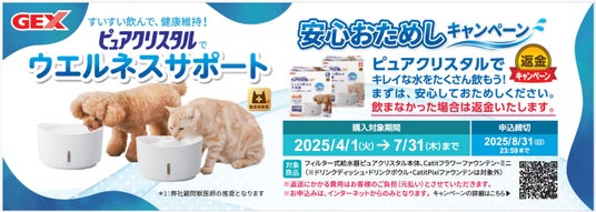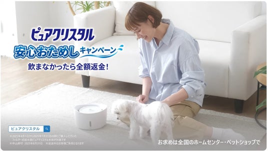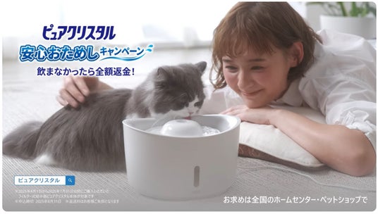 ジェックス株式会社(本社:大阪府東大阪市、代表取締役社長:五味宏樹)は、ネコちゃん・ワンちゃん用フィルター式給水器「ピュアクリスタル」の新TVCM、ネコちゃん用「お水、ちゃんと飲んでる…?きれいでおいしい軟水に!(15秒)」、ワンちゃん用「お皿のお水、汚れてるね…フィルターが汚れをしっかりキャッチ!(15秒)」を、2025年7月1日から関東全域・関西全域で放映いたします。