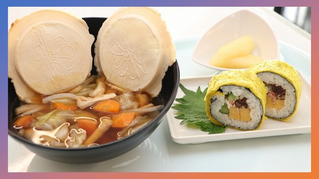 調印式にあわせて、TONICHIの食堂では南部町の郷土料理を提供する「南部町フェア」を開催しました。南部町の全面協力の下、フェアでは県内一の生産量を誇る南部町特産の食用菊「阿房宮」を使用した『菊巻寿司』、「かやき」と呼ばれるせんべいが入った『せんべい汁』、りんごを甘く柔らかく煮た、どこか懐かしくやさしい味の『煮りんご』が提供されました。