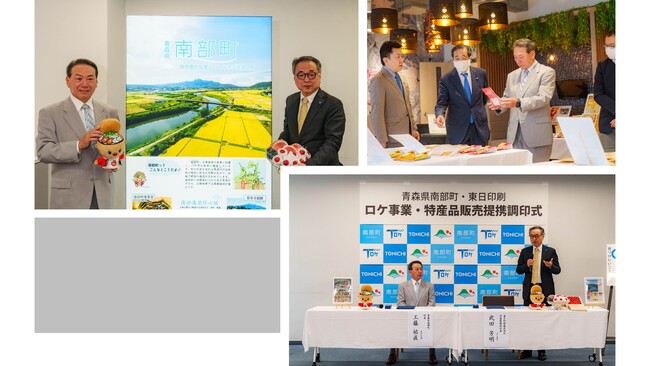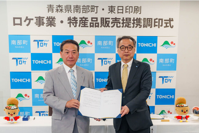 東日印刷株式会社(本社:東京都江東区、社長:武田芳明 以下、TONICHI〈https://tonichi-printing.co.jp/〉)は、青森県南部町(町長:工藤祐直)とロケ誘致および特産品販売で提携し、7月20日(木)にTONICHI本社ビルで調印式を行いました。TONICHIは2020年に福島・猪苗代町とロケ誘致事業で提携をしており、これで自治体との提携は2例目、特産品販売も含めた包括提携は初となります。