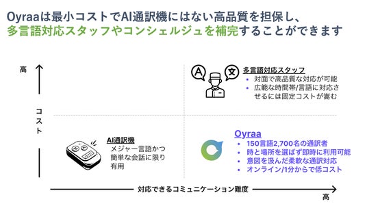 24時間365日いつでも予約不要で通訳者を呼び出し1分単位で利用できる通訳アプリ『Oyraa』を提供。「グローバル通訳者ネットワーク×スマホアプリ」によって、現状のAIでは実現できない高い品質・柔軟性を兼ね備えた ”人間ならでは” の通訳を誰もが簡単に、かつ低コストで利用できるサービスを実現しています。