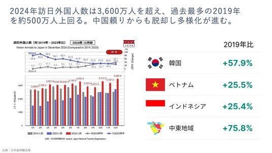 2024年には訪日外国人数が3,600万人を超えました。これは過去最多だったコロナ前の2019年の人数を約500万人上回るもので、インバウンド観光が完全に復調したことを示しています。また、これまで日本のインバウンド観光は中国人団体観光客に支えられてきましたが、現在は中国以外の東アジア・東南アジア、そして中東地域などの成長が著しく、訪日外国人の国籍・言語の多様化が進んでいます。