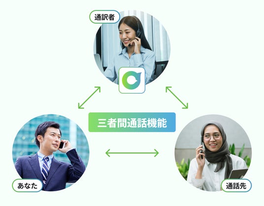 対面の会話はもちろん、三者間通話機能により通訳者を加えた状態で第三者 (固定/携帯番号) に電話をかけることもできるため、あらゆるシーンに対応することができます。