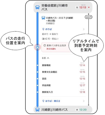 本市では、現在、複数事業者や多くの系統で構成される市内路線バスを利用しやすくするために、市内路線バス事業者(川崎鶴見臨港バス株式会社、東急バス株式会社、小田急バス株式会社、川崎市バス)がそれぞれ提供しているリアルタイム運行情報を、共通化して調べやすくする実証を実施しており、本取組はその一環です。