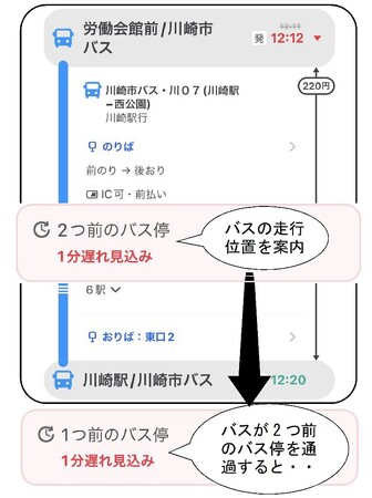 ・乗車後の現在のバスの位置、バス停の通過予定時刻、到着予定時刻を案内