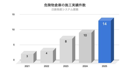 システム建築の専業メーカーである日鉄物産システム建築株式会社(本社:東京都港区、代表取締役社長:宇野 智)は、危険物倉庫の施工需要が高まるなか、過去5年間で20件・39棟の危険物倉庫を施工した実績を公開しました。また、危険物倉庫に関する問い合わせ件数は2021年の9件から2025年には30件と約3.3倍に増加し、施工実績も同期間で3件から14件へと約4.6倍に拡大しています。