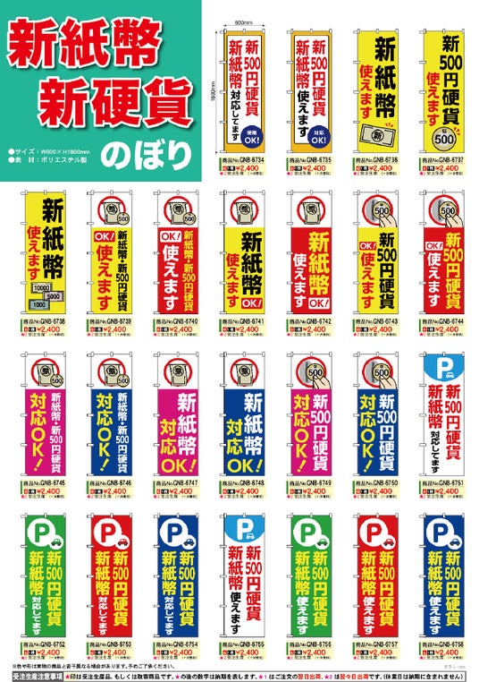 新しい紙幣と硬貨が登場しました!それに伴い、新しい紙幣と硬貨が利用できることをアピールするためののぼり旗をご用意いたしました。店舗や駐車場などでの告知に最適です。