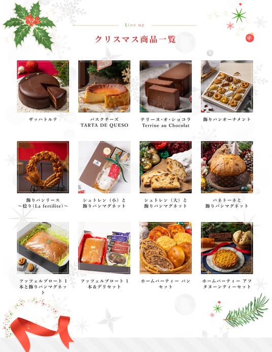 ホームパーティーにおすすめのパンセット、ここでしか買えない飾りパンオーナメントなど、クリスマスを彩る12品をラインナップ。