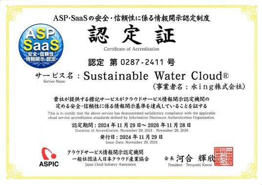 水ing株式会社(社長:安田 真規、本社:東京都港区)は、2024年11月29日、一般社団法人 日本クラウド産業協会(略称:ASPIC)より、当社の情報プラットフォーム「Sustainable Water Cloud(R)」(以下、SWaC(R))が「ASP・SaaSの安全・信頼性に係る情報開示認定制度」の情報開示基準に達成していると認定されました。