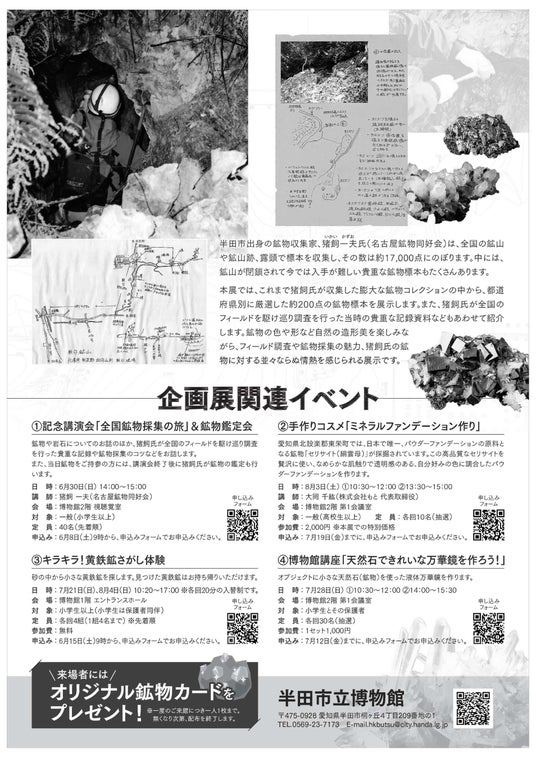 半田市出身の鉱物収集家、猪飼一夫(いかい かずお)氏の鉱物コレクションの中から、都道府県別に厳選した200点以上の鉱物標本を展示します。また、猪飼氏が全国のフィールドを駆け巡り調査を行った当時の貴重な記録資料などもあわせて展示します。