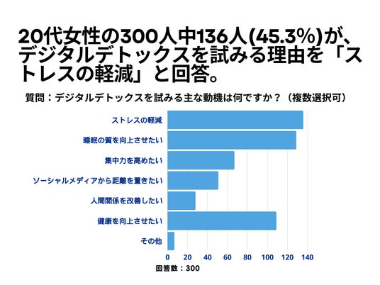 20代女性の300人を対象とした「デジタルデトックスを試みる主な動機は何ですか?」というアンケートで136人(45.3%)が「ストレスの軽減」という結果になりました。