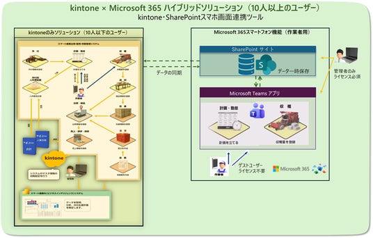 データ管理等を行うメインのシステムは、拡張性の高いkintoneで構築し、多くのユーザが利用するスマホ画面は、ライセンス利用料的に安価なMicrosoft 365を利用ます。「kintone・SharePointスマホ画面連携ツール」は、kintoneのデータをSharePointに自動同期させ、Microsoft Teamsを通じてスマートフォン画面を稼働させます。