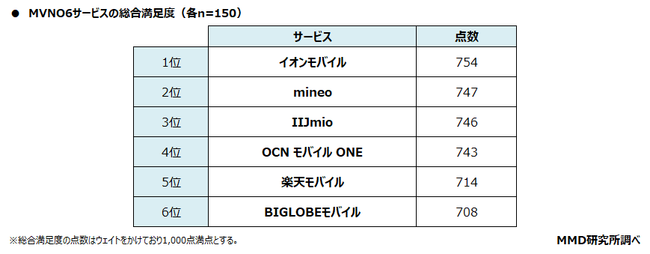 予備調査からMVNO6サービスを利用している900人(各n=150)を抽出し、利用しているサービスの総合満足度を聞いたところ、「イオンモバイル」が754ptでトップ、次いで「mineo」が747ptとなった。