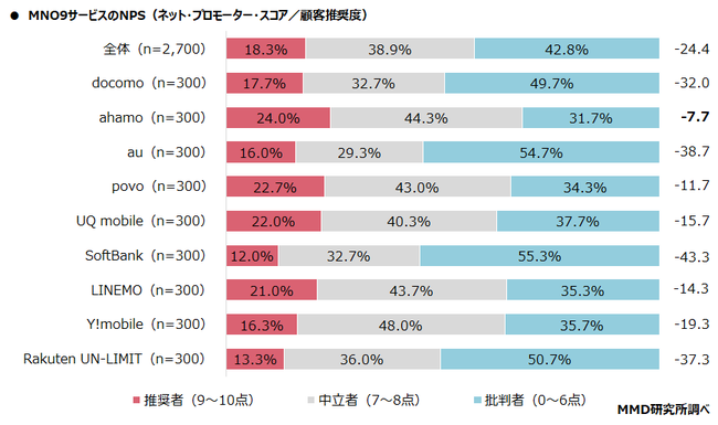 MNOを利用している2,700人(各n=300)を対象に、家族や友人にお薦めしたいかどうか10点満点の点数をつけてもらい、NPS(ネット・プロモーター・スコア/顧客推奨度)を出したところ、9点から10点をつけた推奨者が18.3%、7点から8点をつけた中立者は38.9%、0点から6点をつけた批判者は42.8%となり、推奨者から批判者を引いたNPSは-24.4となった。サービス別のNPSは、「ahamo」が最も高く-7.7、次いで「povo」が-11.7となった。