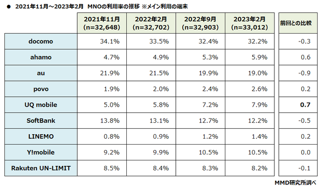 メイン利用しているスマートフォンでMNOを利用している33,012人を母数とし、MNO各サービス割合を求め2022年9月(n=32,903)と比較すると、最も割合が増えたのは「UQ mobile」で0.7ポイント、次に「ahamo」が0.6ポイントとなった。