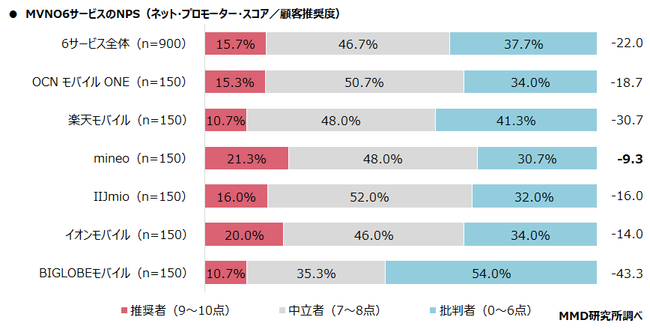 MVNOを利用している人(各n=150)を対象に、家族や友人にお薦めしたいかどうか10点満点の点数をつけてもらい、NPS(ネット・プロモーター・スコア/顧客推奨度)を出したところ、9点から10点をつけた推奨者が15.7%、7点から8点をつけた中立者は46.7%、0点から6点をつけた批判者は37.7%となり、推奨者から批判者を引いたNPSは-22.0となった。サービス別のNPSは、「mineo」が-9.3で最も高く、次いで「イオンモバイル」が-14.0となった。