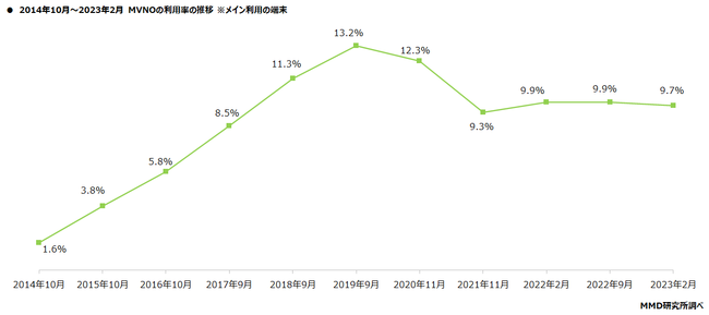 メイン利用のスマートフォンがMVNOである割合の推移を見てみると、2022年9月の9.9%から0.2ポイント減少した。