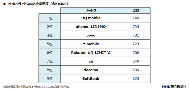 ■ MNOの総合満足度は「UQ mobile」が740ptでトップ