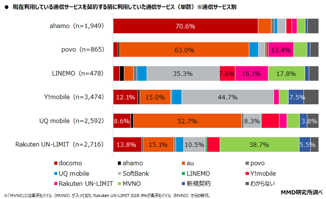 ■ ahamoは70.6%、povoは63.0%、LINEMOは35.3%が同一キャリアから移行