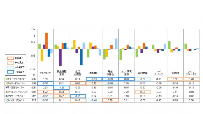 ◆クラスタ別のクルマ意識による因子得点では、『居住快適性』を「ファミリードライバー」が求めるのに対し、「ステータスホルダー」、「デイリードライバー」はポイントが低いことや、『安全運転意識』を「ホリデードライバー」「カーエンスージアスト」が高いのに対し、「平均的ドライバー」はポイントが低いなど、クラスタごとの特徴が明らかになった <図3>