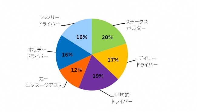 ◆各クラスタの割合では、「ステータスホルダー」が20%と最も高く、次に「平均的ドライバー」が19%と続く。最も低い割合は「カーエンスージアスト」の12%となった <図2>