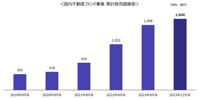 お客様からの旺盛な需要に応えるため、都心一等地の不動産を積極的に取得し、組成と販売の好循環を確立させた結果、2023年9月期の販売額が445億円超となり、3期連続で過去最高販売額を更新いたしました。また2023年12月には、過去最大の大規模案件である「FPGリンクス渋谷道玄坂※」が好評のうちに完売となるなど好調な販売が継続しており、2023年12月末時点で国内不動産ファンド事業の累計販売額が1,600億円を突破いたしました。