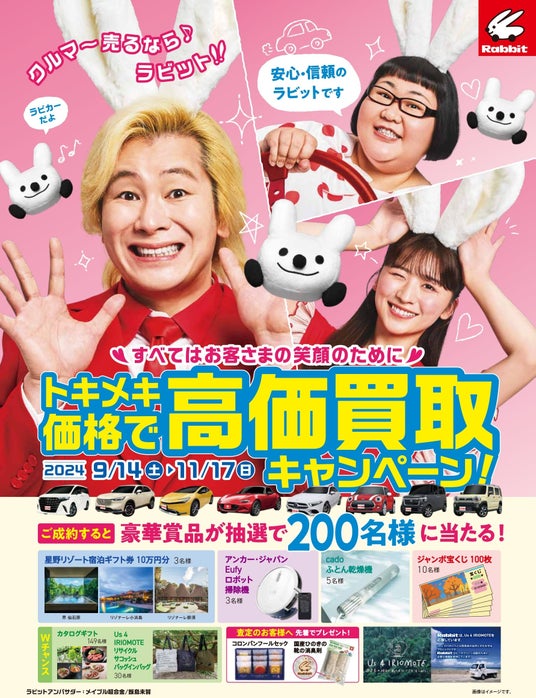株式会社ラビット・カーネットワーク(本社:東京都江戸川区臨海町、代表取締役社長:山中 雅文)が運営する自動車買取・販売の「ラビット」では9月14日(土)~11月17日(日)まで『トキメキ価格で高価買取キャンペーン!』を実施いたします。