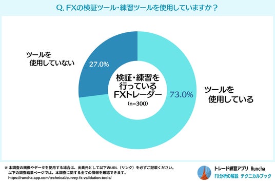 FXの検証・練習における専用ツールの使用状況を調査したところ、73.0%がツールを使用しているという結果になりました。検証・練習を行う際には、専用ツールを使用するのが主流といえそうです。