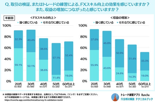 - 8割以上が検証・練習によってスキル向上や収益増加を感じており、20代・30代では9割を超える