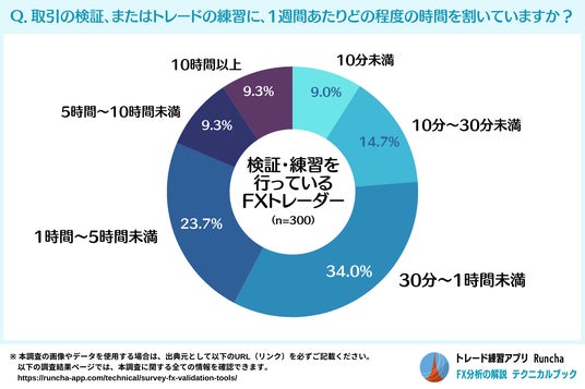- 82.6%のFXトレーダーが検証・練習に取り組んでおり、週あたり1時間前後の時間を割く人が多い