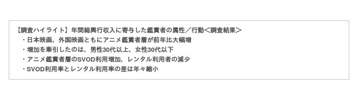 以上のように、「GEM映画白書ダッシュボード」を用いれば、映画・映像ビジネスを考える際に必要な映画鑑賞者の属性や行動心理の“なぜ”や“変化”への素早いアクセスが可能です。そして、今回ご紹介したアニメ鑑賞者についての分析のように、“●●に違いない”といった直感的な判断ではなく、“具体的なデータ”で裏付けることができるのです。