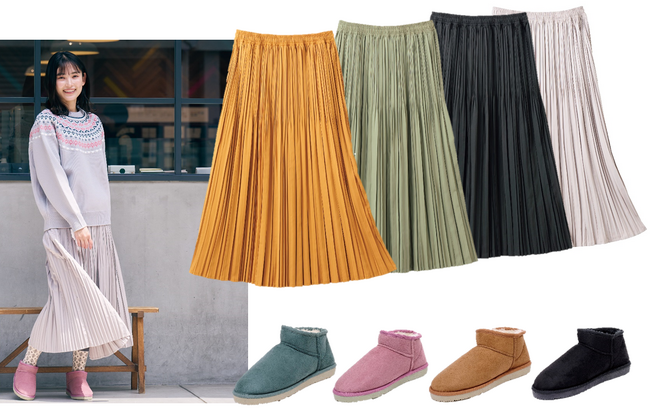◆超撥水加工で人気のプリーツスカートに縦ラインのランダムプリーツが登場!人気のムートン風ブーツは新色でオシャレに