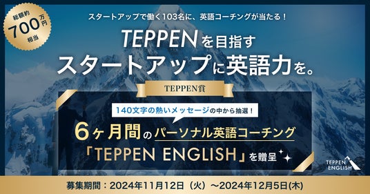 本キャンペーンは、日本のスタートアップ企業がグローバルに活躍できるきっかけとなることを目的に、抽選で103名のスタートアップ企業で就業する方に、総額約700万円相当の英語コーチングサービス『TEPPEN ENGLISH』をプレゼントするスタートアップ応援キャンペーンです。