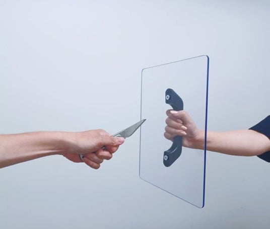 普段は広告やお知らせ用の案内板として使い、いざというときは防御盾に早変わりする、フェーズフリーな防犯用品です。片手で持てるほど軽く、しかも丈夫な5mm厚の盾で、不審者などの攻撃から身を守る優れモノです。掲示板としての機能的な日常使いから、盾としての非常時使いまで場面を超えて活躍する、まさにフェーズフリーな盾です。
