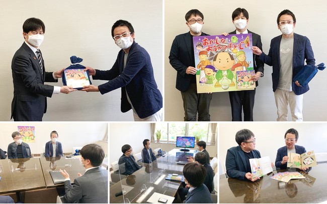 絵本の出版・動画公開にあたって、制作協力をいただいた松江菓子協会 会長 山口周平様と共に贈呈式を執り行い、松江市 上定昭仁 市長へ絵本をお贈りいたしました。