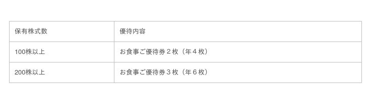 株主優待内容については従来から変更なく、保有株式数に応じて、下表のとおり当社グループの国内直営店などでご利用いただけるお食事ご優待券を贈呈いたします。ご優待券一枚につき券売機のボタンの中からどれでも1つお選びいただきます。(券売機のない店舗ではメニュー表から1品となります。)