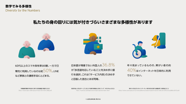 特に、これからの日本が直面する人口の1/3が高齢者となる超高齢社会、労働人口の減少による外国人労働者の増加、地方の過疎化を背景とした、デジタル格差、PC・スマートフォンの利用比率などを考慮したインクルーシブな取り組みが求められています。