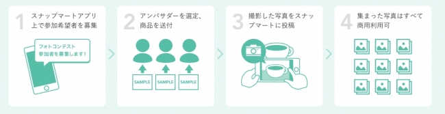 Snapmartに写真を投稿・販売しているクリエイターから参加者を募り、開催企業が参加者(アンバサダー)を選定の上、「自社商品のサンプリング」及び、「SNSプロモーションに効果的なクオリティの高いユーザー撮影による写真・動画の大量収集」と「ユーザー体験(クチコミ)の拡散」を依頼することができるサービスです。